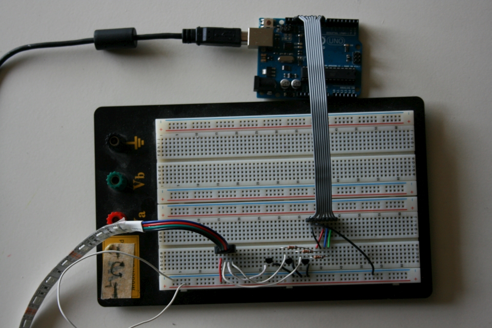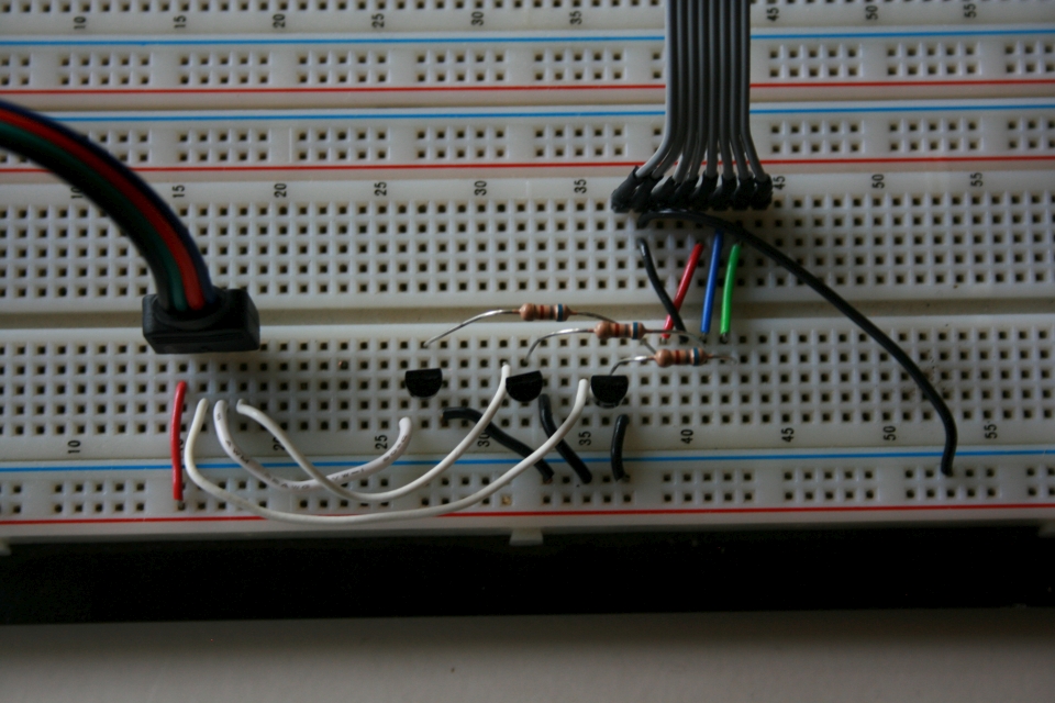 Here are some images of the project. You can see the three transistors on the breadboard with the LED strip running off to the left. I used a short ribbon cable to connect the Arduino to the transistors. The USB cable coming from the Arduino goes straight to the OTG cable connected to my Android phone.