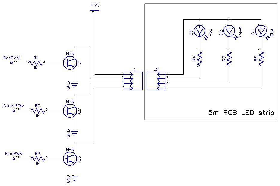 The LED strip has probably about a million LEDs in parallel, so each color can draw up to about 1.5A at full brightness. The poor Arduino would try its best, but those digital I/O pins simply can't output that kind of power. With a transistor, the signal from the Arduino's I/O pins can be used to switch the much higher current required to drive the LED strip. Three NPN transistors and a 12V power supply later, I had a simple LED driver circuit. The 1K resistors connected to the base of the transistors are there to limit the current going into the base. Ususally this would be higher (~10K) but I was overdriving my little transistors: they are rated for 0.1A, and I was passing 1A through them... If you give this a try, I recommend getting higher power transistors rated for at least 2A.