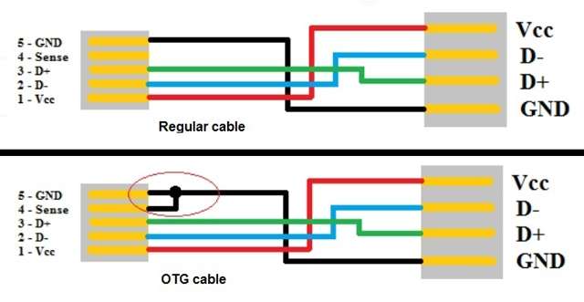 To make the physical connection between Arduino and Android, I needed a USB On-The-Go (OTG) cable. Since I didn't have one and Fry's was closed, I made one from two old USB cables. You simply short pin 4 to pin 5 (GND) on the micro USB connector and then replace the male USB A end with a female USB A connector. There is a nice tutorial over on the xda forums