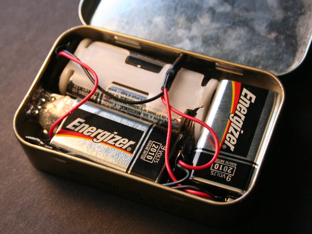 First off, let me say this was not my idea. I got the idea from Chris Diclerico, then found out UnixMonkey and Drew Perry made very similar battery packs. This portable charger is perfect for camping, road trips, and plane flights, although airport security may not be to happy with a suspiciously disguised box full of wires. It's also great for those, "D'oh! I forgot to charge my iPod, and I gotta leave now!" moments. Drew Perry says you can get about 10 hours worth of play from it, which is a heck of a lot. And now, onto the how-to. Note: I do not know for sure if this battery pack will work with anything other than a 3rd Generation iPod, but it will probably work with an iPod mini.