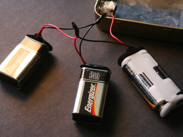 ![]() The first step is to put everything in it's place - with no solder or glue yet. The battery arrangement I used is at the left. You can see the firewire port in the lower left corner of the tin. That's where you want your hole. Trace out the firewire shape and cut it out with a Dremel and a metal file. Next, solder the 3 battery connectors together as in the schematic above. You can see a pictorial version to your right. Cover the soldered ends with electrical tape to prevent shorts, and be sure not to connect the batteries yet. At this point, you should have two free wire ends. One red, one black. You see on the port how there's the metal port, and then a black plastic piece with pins sticking out of it? Bend back the 2 metal tabs holding the plastic piece in and pull it out. Now you can put the metal part into the hole you made and solder all around the edges onto the inside of the tin. That baby's not goin anywhere. Going back to the plastic piece, solder the red battery wire to pin 1 and the black one to pin 2 (refer to the schematic). Be extra careful to use only a little bit of solder, because you do not want a solder bridge between pin 1 and 2. Now, insert the plastic piece into the metal bit and fold the little tabs back down. Slather hot glue all over the connections between the firewire pins and the battery wires to be sure they don't break. Finally, connect the batteries, and put them in their places (it may be a tight fit, but they'll go). Close up the tin, and if you have one, use a multimeter (voltage tester) to make sure you have about 12 volts. If not, pray you did everything right, or borrow one from a friend. If it fails the test, go back and un-tape your wire ends, and inspect them. Make sure they are nice and tight, with plenty of solder. Also check the batteries to make sure they even work. If you still can't get it to work, feel free to email me. If everything works fine, connect a firewire to dock connector cable, and hook up your iPod. |