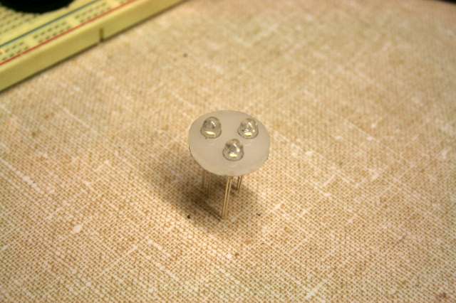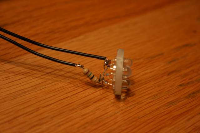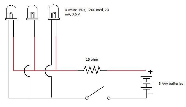 First, let me say that this Instructable helped me out a lot. Second, this formula is important: R = V/(N*I) where V is the voltage difference between the LED's rated voltage and the voltage you will be supplying, N is the number of LEDs and I is the current rating on the LED. Since I was going to be using 3 LEDs and 3 AAAs to power them, my value came out to (4.5-3.6)/(3*.02) = 15 ohms. Thus, I need one 15 ohm resistor in the circuit to keep the LED from burning out. To connect the LEDs, just bend all the short leads together and also bend all the long leads together, being sure there are no short-long leads touching. Then solder the resistor onto either the positive (long) or negative (short) terminals. See the wiring diagram for more detail on the circuit. Below is another image of the wiring, further along in the process. |