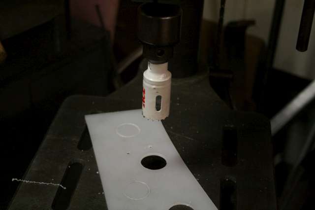 First, you have to create a mount for the 3 LEDs. I chose to use some translucent plastic (about 1/4" thick) that was laying around. Cut out a hole with a drill press and a hole saw that's approximately the same size as your hose adapter's opening (the black rubber side). You may want to cut halfway through the plastic to give an outline, do step 2, and then finish cutting out the piece. It's a lot easier to hold a large sheet of plastic than a 1 1/4" disk under a drill press. Once you do get all the way through the plastic, quickly get the plastic disk out of the hole saw with a flat screwdriver or something like that. It's easiest to get out when the plastic is still soft from the heat of friction. |