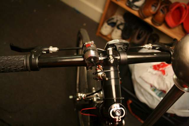 I mounted my light with that hose clamp you see up in the parts list. The hose adapter came with a hose clamp around it, so I added a second one to actually mount it on the handles, as shown in the picture. As for the switch and battery pack, I just used a couple of zip ties. I also tied the wires to the handles to keep them in place. Try to make everything as tight as possible so nothing falls off if you go over a big bump. |