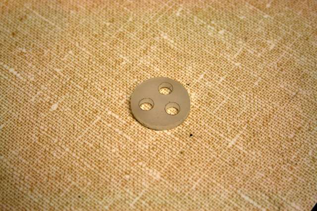 I drilled three 5mm holes in an equilateral triangle pattern, but theoretically, you could do any pattern you wanted, so long as the LEDs fit in. Again, it's best to do this hole-drilling before completely cutting out the disc of plastic. I tested the bit size on a scrap piece of plastic to be sure the LED fit. It should be snug, but easy to get in. After drilling the LED holes, I brought the disk over to a grinder (you can use a file or sandpaper) to make it smaller, as there was no hole saw small enough to make a disk that would fit in the hose adapter. This step not only allows it to fit snugly, but it also makes the edges crisp and clean. |