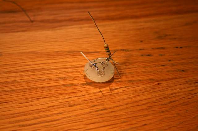 Next you need to add the wires which will eventually connect the light to the on/off switch and the AAA power supply. I chose to use some solid-core wire I had laying around, but you can use whatever you think will work. Basically, one wire gets soldered onto the short (negative) LED leads, and one wire is soldered onto the resistor. It's best to keep the whole affair pretty small, with as short leads as possible so you'll be sure it will fit in the housing at the end. Make a mark on the positive lead so you'll know which one it is when it comes time to connect the battery pack. |
