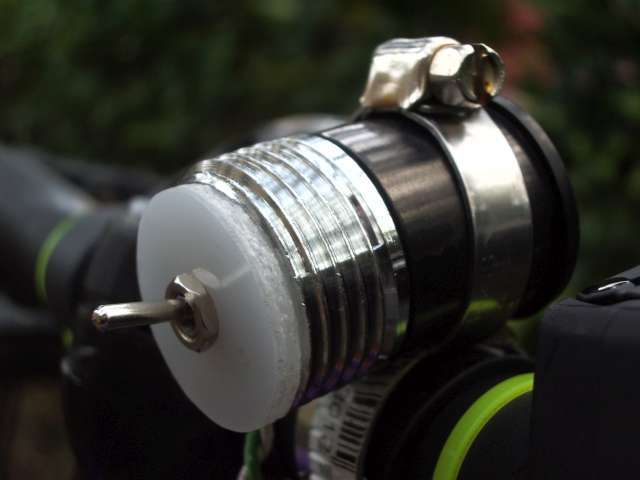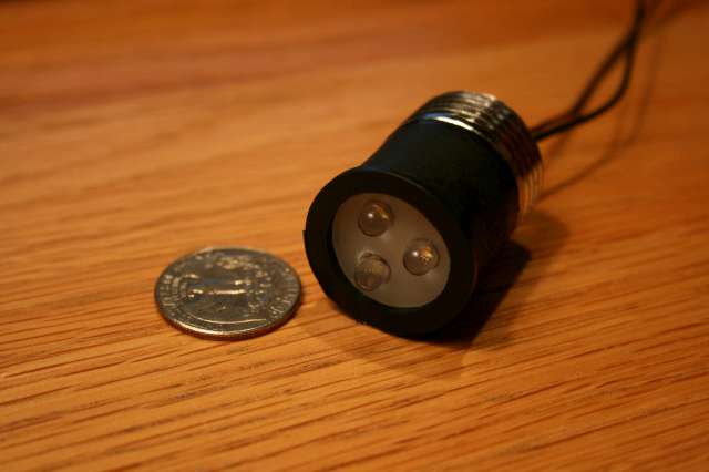 The light should fit snugly in the plumbing hardware, with the wires coming out the threaded hole in the back. You may have to stretch the rubber a little, but if you checked the plastic insert's fit before, in step 2, you know it will fit. Be careful not to break any of the soldered joints or bend any of the leads. I found that no glue was necessary, because the rubber keeps everything where it needs to be. If you have to, I would suggest a thin film of epoxy on the inner surface of the hose adapter to keep the white plastic insert in place. I made a small shim out of some extra rubber that came with the plumbing hardware. That, with some electrical tape wrapped around the wires, made the hole in the back sufficiently small to keep the wires in place (and water/debris out). |