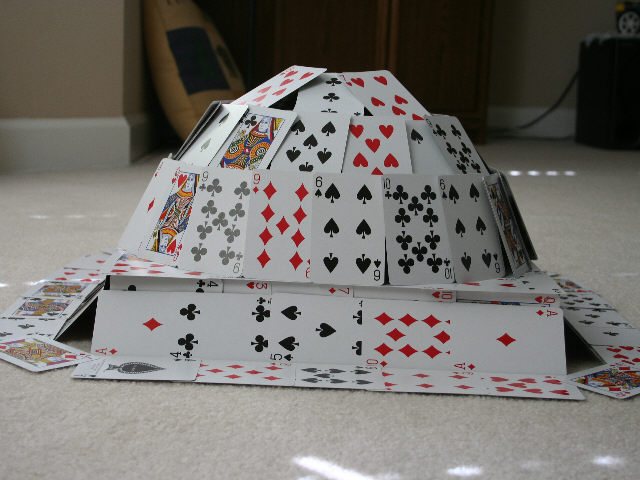 These are some of the houses of cards I built after I recieved Stacking the Deck by Bryan Berg for Christmas one year. The basic principle is very easy. The whole house consists of units of 4 cards each supporting each other, called "cells". The only problem is if one cell collapses, many, many more will collapse also!