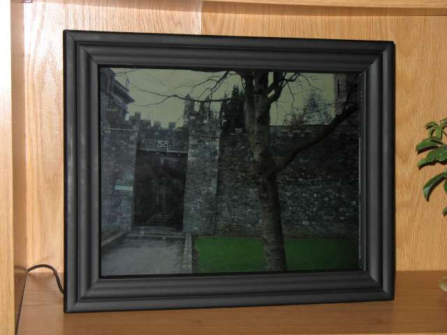 Making it Show PicturesSo, after all that work, I essentially had a very small computer. With no mouse. Or keyboard. What I was basically looking for was a slideshow screensaver which had some specific capabilities: the ability to randomize the photos, a 'fade' transition, and a delay of at least 5 minutes. The slideshow screensaver that comes with Windows XP doesn't have all that functionality. I did some searching online and found a program called gPhotoShow. I set the time before the screensaver starts to its lowest setting, 1 minute. Then I went into the power settings and told the monitor to always stay on, the computer to never sleep, and the hard disk to shut off after the minimum time, 3 minutes. The pictures are set to change every 10 minutes, with each transition being the slick fade option. |