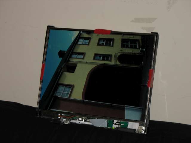 The first step was to gut the computer. If I wanted it to fit inside a fairly thin frame, I had to remove all the ungainly plastic pieces, as well as many of the "useful" parts. This was probably the easiest (and maybe the most satisfying) part of my frame project. With all the plastic bezeling off, the computer does look rather...naked, but at least it's smaller. I actually ended up removing most of the internal components. CD-ROM? Who needs it? Keyboard? For what? Hard drive? Nonsense...er..nevermind. I removed the CD-ROM (both of them), keyboard, speakers, network card, trackpad, and battery. That sure slimmed er up a bit. All that was left now was basically a motherboard, hard drive, and monitor--perfect for displaying pictures. Actually, in my frame's early life, it still had some of the extraneous plastic, namely the bottom plastic bit everything was bolted down to. It turned out that it wasn't needed after all, and I removed it later on. |