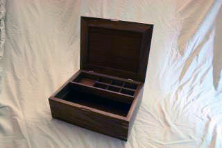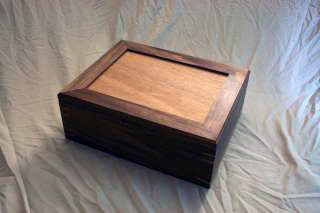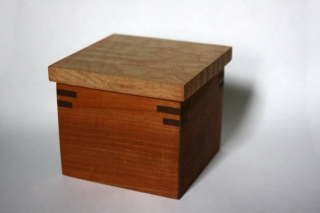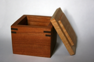 Here is the first type of box I made. It's a cute little one for holding trinkets and small things. I learned how to book-match wood, join corners with keys, and generally learned my way around the shop. I actually made two, with slightly differing lids. The box is mostly made of cherry, and the corner keys are walnut. The whole thing was finished off with Danish oil.