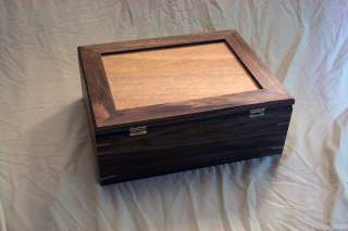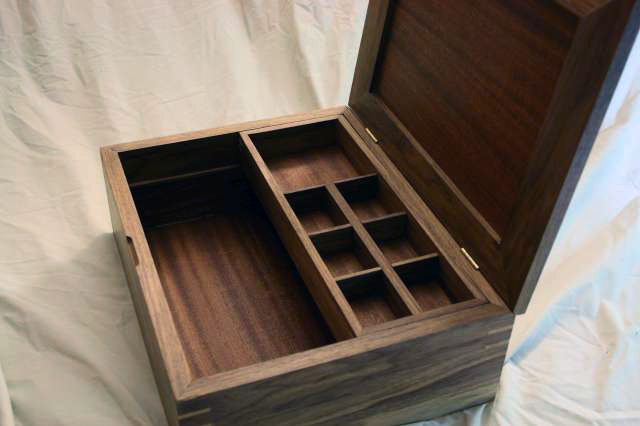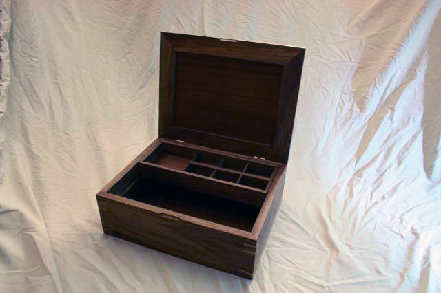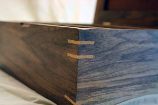 This box is a multipurpose one that I made for my girlfriend. She uses it to store all sorts of things, though it was designed to be large enough to hold letters. The box is mostly walnut, but the corner keys are made of maple. The top surface shown is a birch plywood that is cherry veneered on the inside, but I made a nice top panel (not pictured) out of a beautiful birdseye maple. The box was finished with some Danish oil to bring out the color and grain patterns.